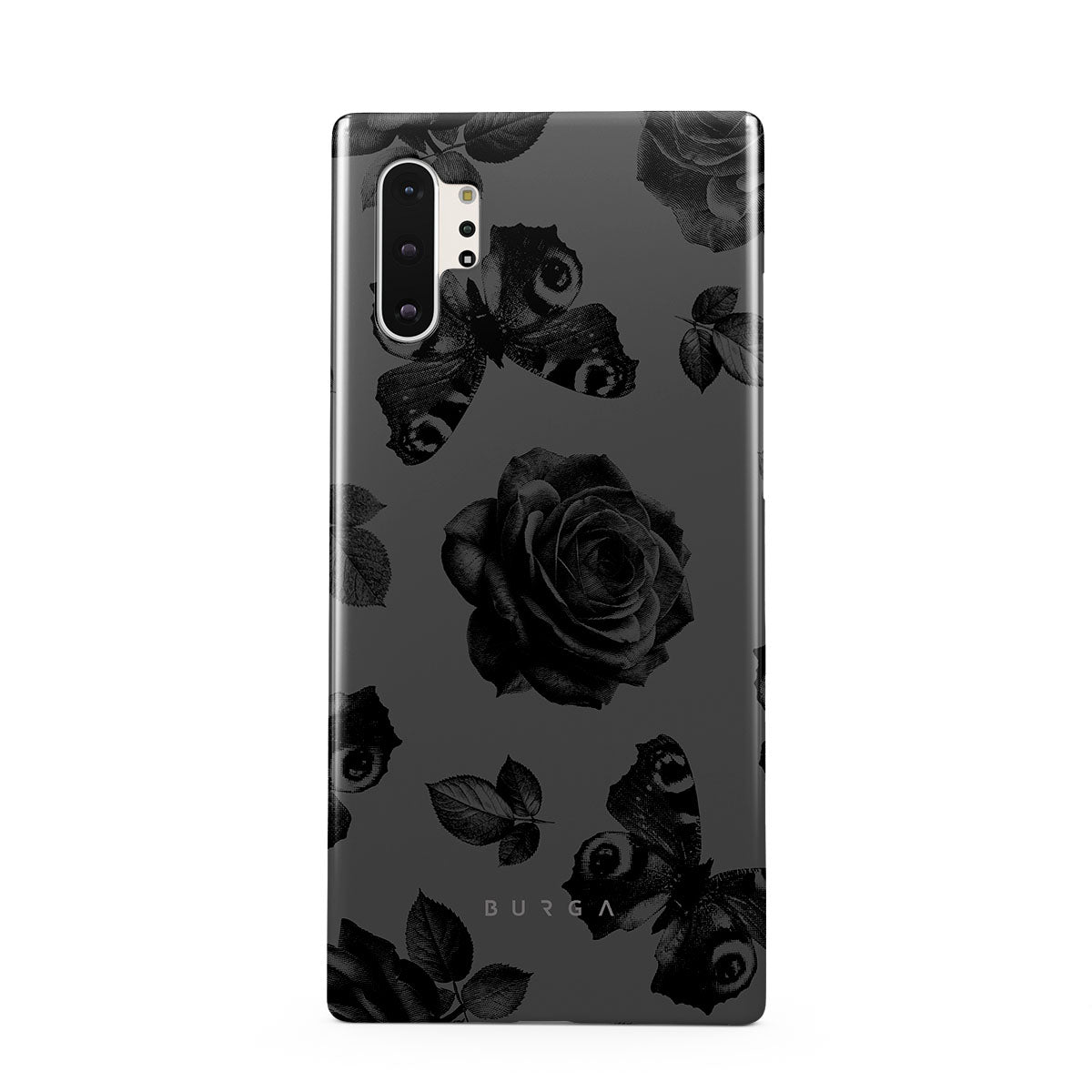 このデザインの特徴:黒いバラ、ゴシック調の花柄、落ち着いた色合い。