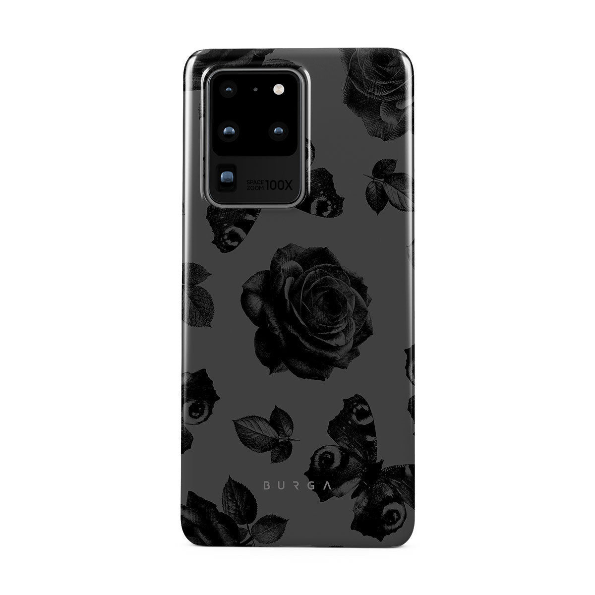 このデザインの特徴:黒いバラ、ゴシック調の花柄、落ち着いた色合い。