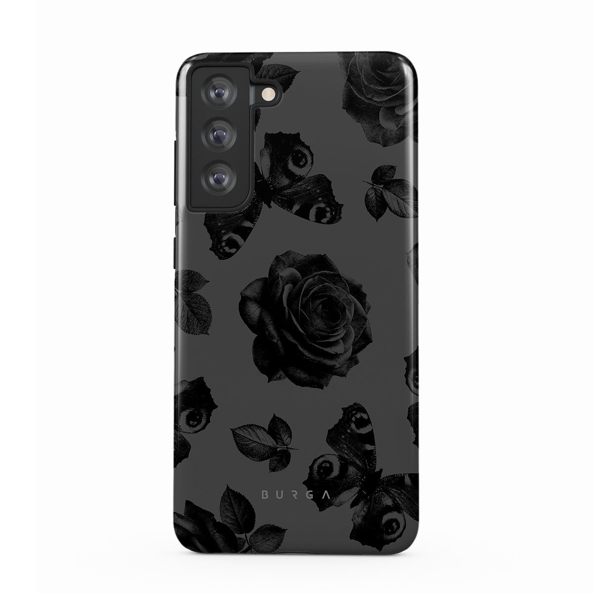 このデザインの特徴:黒いバラ、ゴシック調の花柄、落ち着いた色合い。