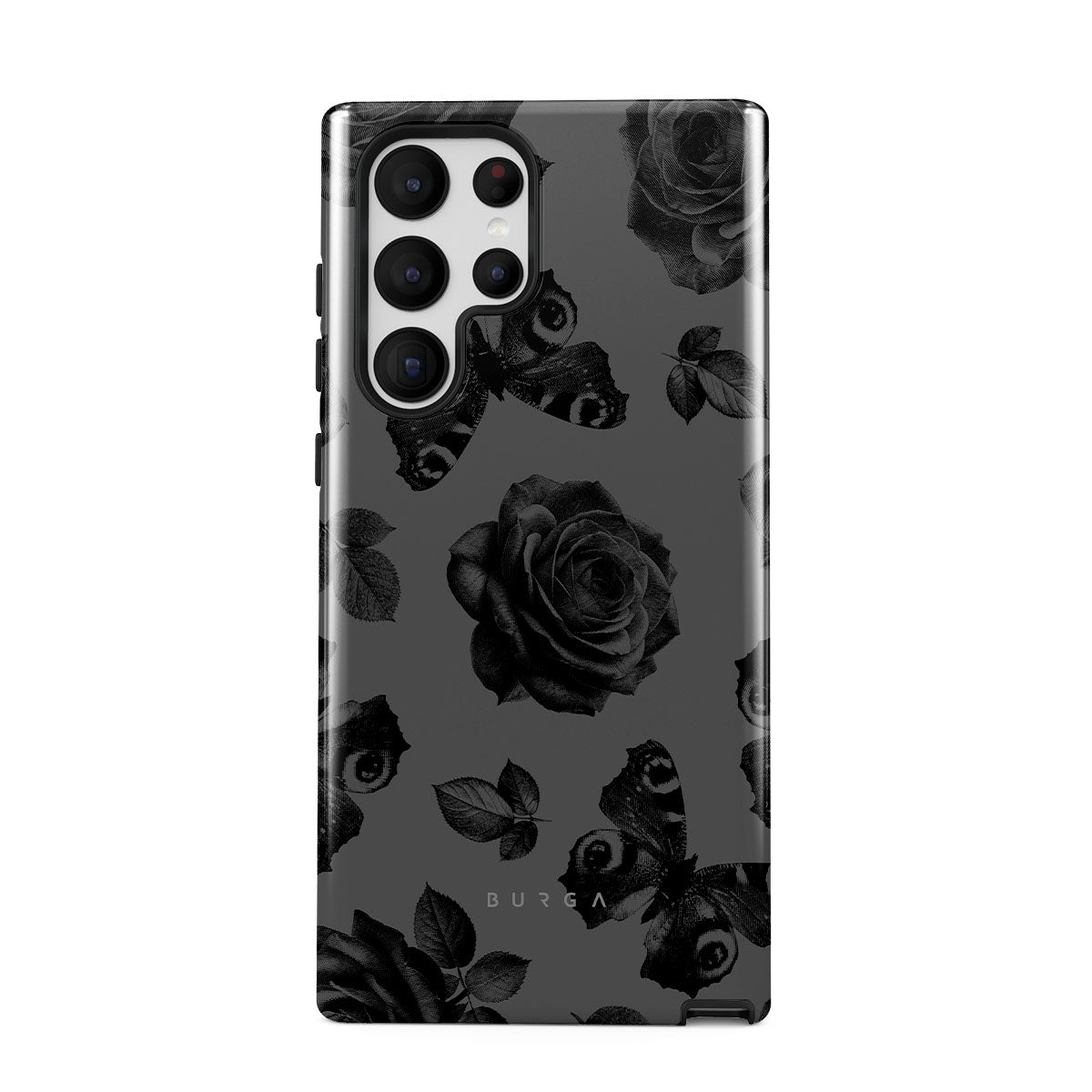 このデザインの特徴:黒いバラ、ゴシック調の花柄、落ち着いた色合い。