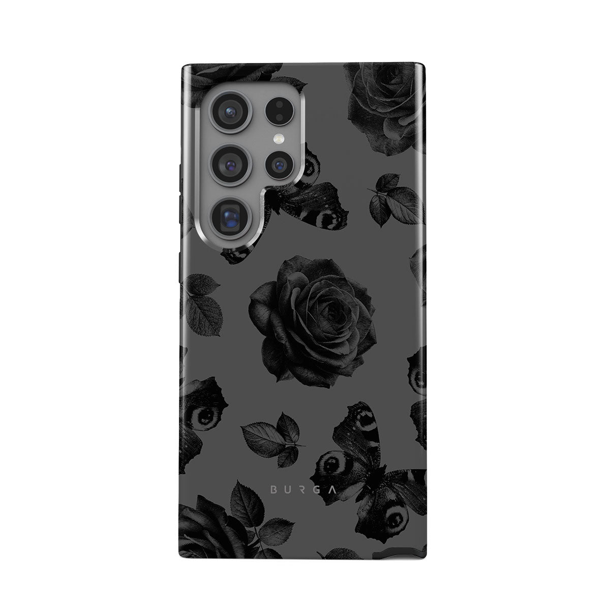 このデザインの特徴:黒いバラ、ゴシック調の花柄、落ち着いた色合い。