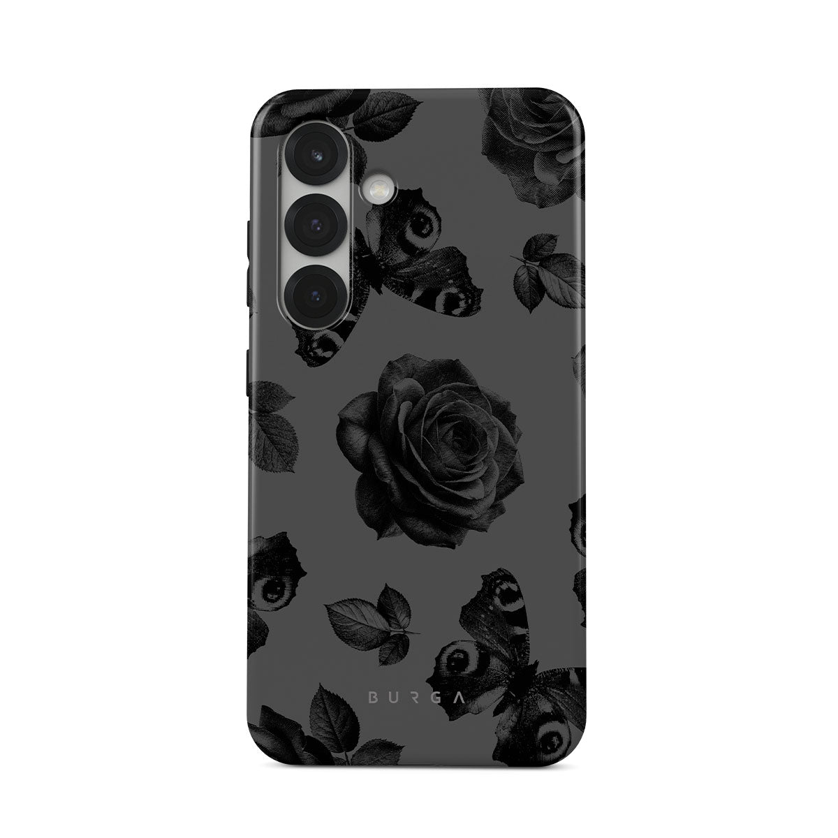 このデザインの特徴:黒いバラ、ゴシック調の花柄、落ち着いた色合い。