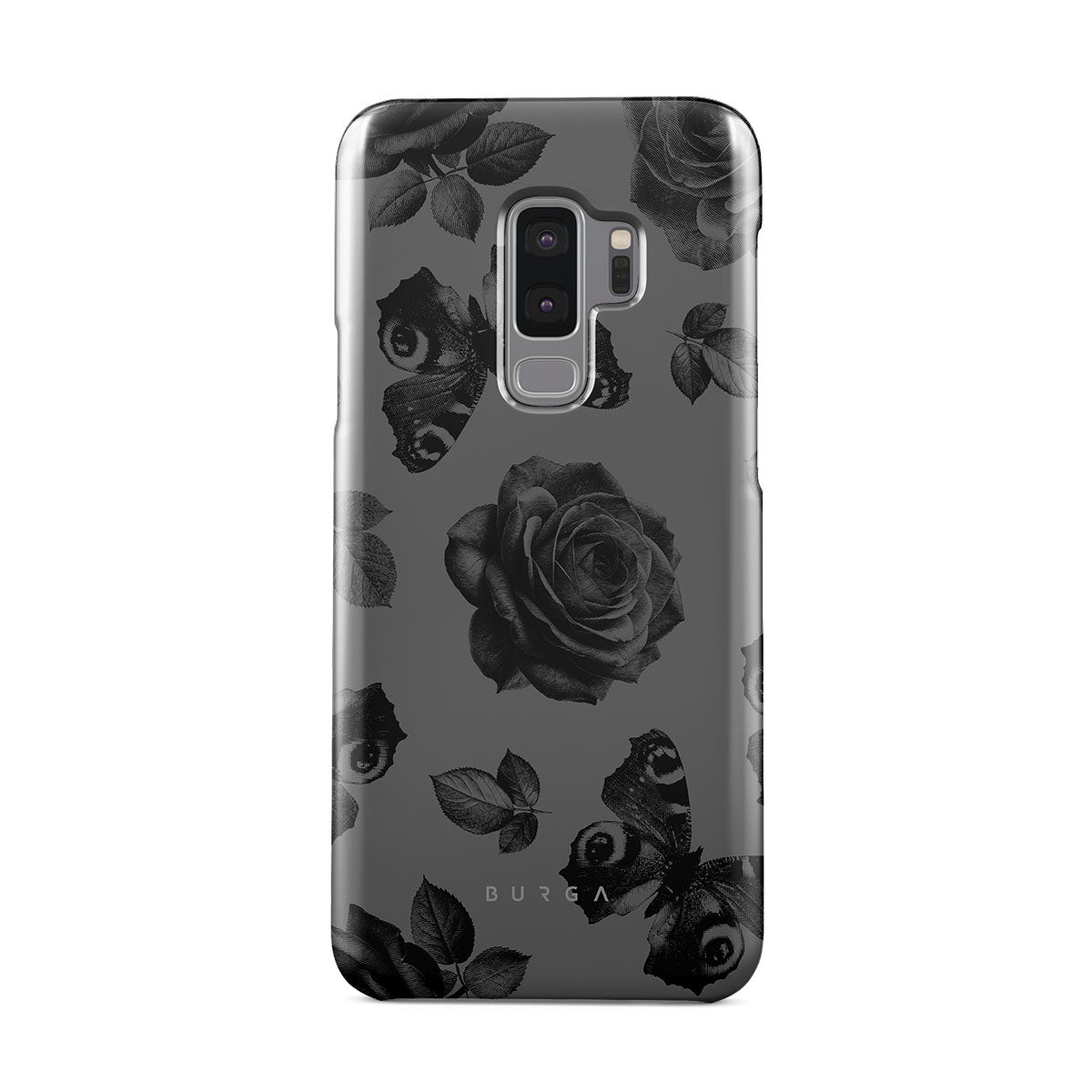 このデザインの特徴:黒いバラ、ゴシック調の花柄、落ち着いた色合い。