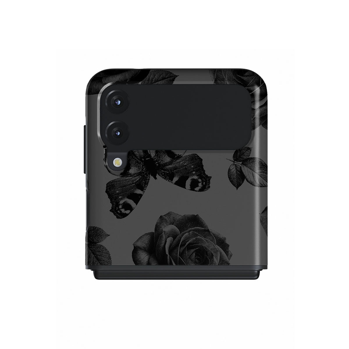 このデザインの特徴:黒いバラ、ゴシック調の花柄、落ち着いた色合い。