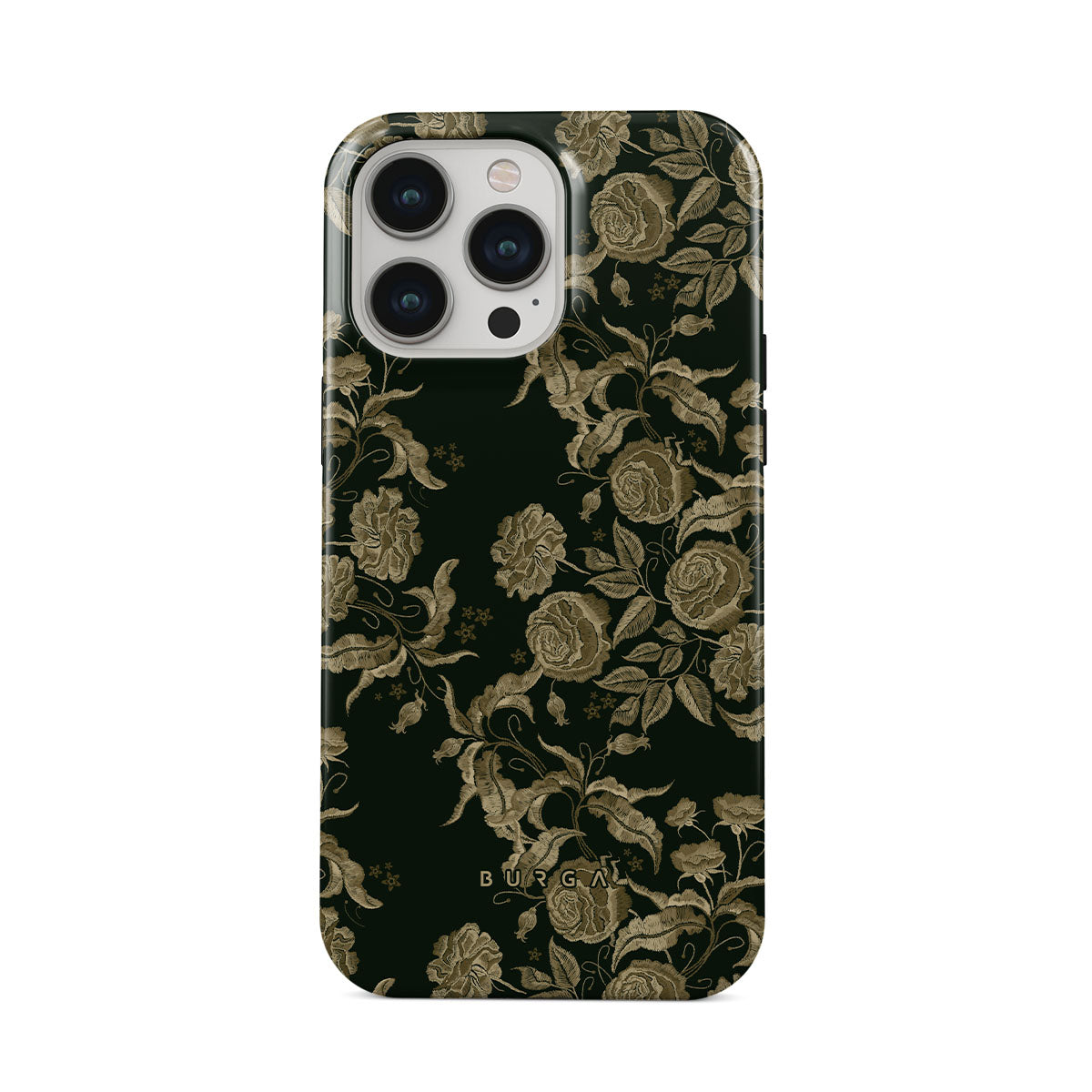 このデザインの特徴:ビンテージ調のバラ、紅葉、深緑の色調。