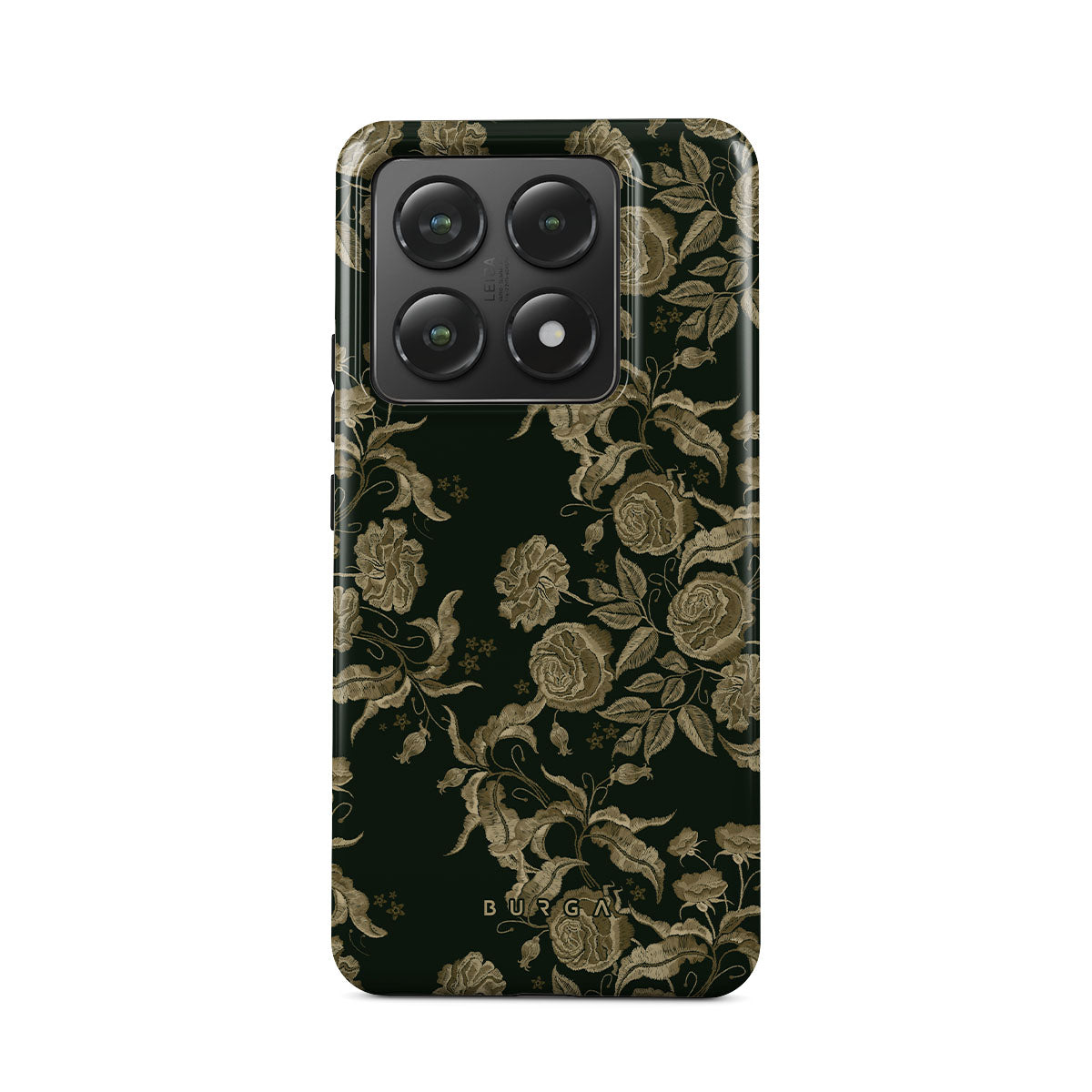 このデザインの特徴:ビンテージ調のバラ、紅葉、深緑の色調。