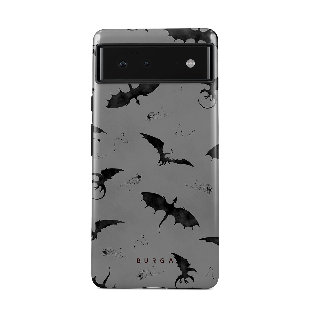 このデザインの特徴:コウモリ、竜、灰色の空、夜空、影の生物。