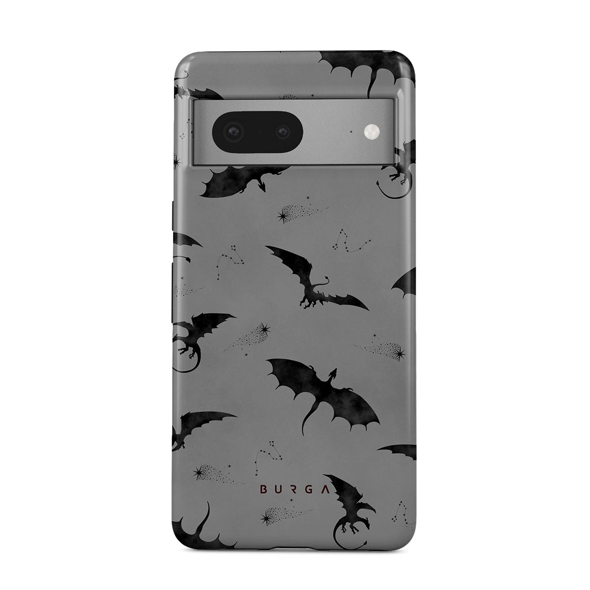 このデザインの特徴:コウモリ、竜、灰色の空、夜空、影の生物。