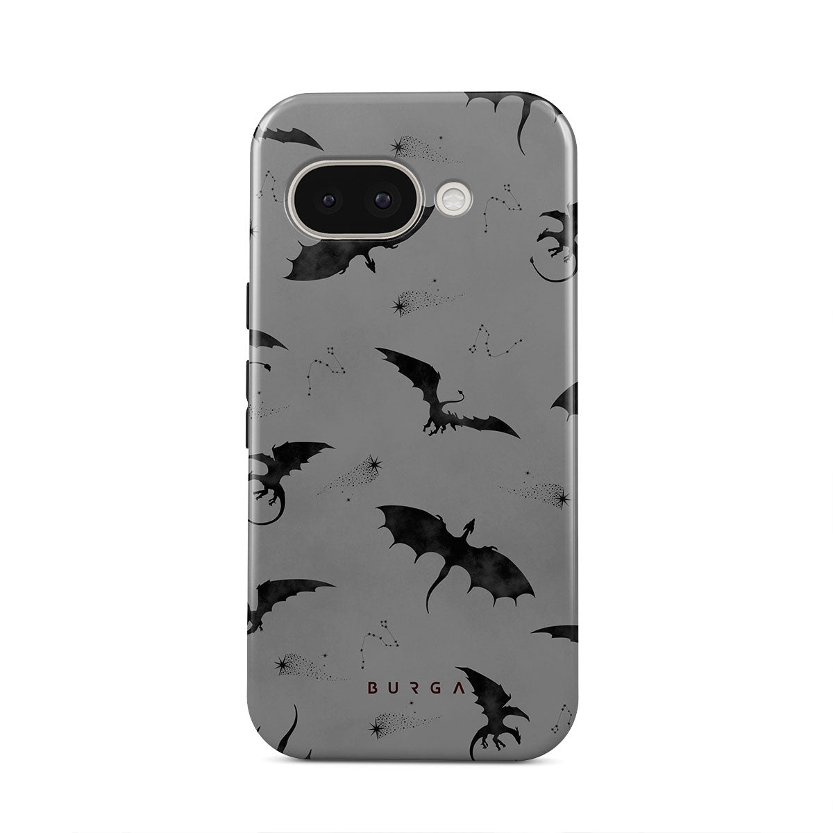 このデザインの特徴:コウモリ、竜、灰色の空、夜空、影の生物。