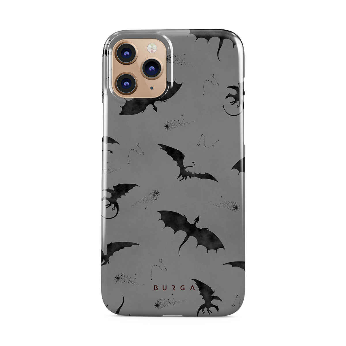 このデザインの特徴:コウモリ、竜、灰色の空、夜空、影の生物。