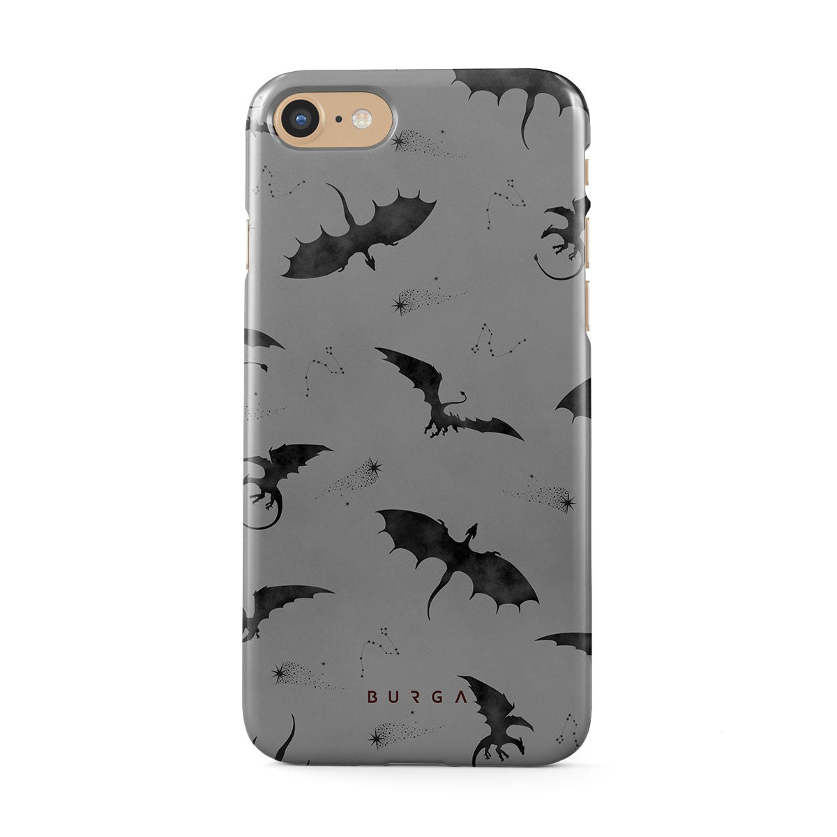 このデザインの特徴:コウモリ、竜、灰色の空、夜空、影の生物。