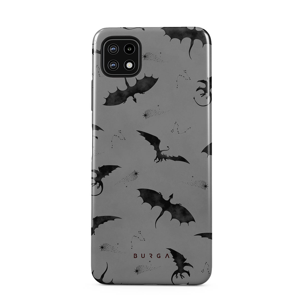 このデザインの特徴:コウモリ、竜、灰色の空、夜空、影の生物。