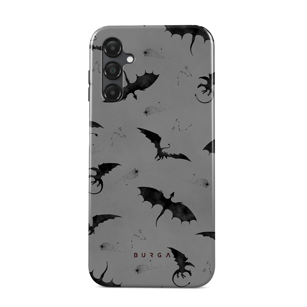 このデザインの特徴:コウモリ、竜、灰色の空、夜空、影の生物。