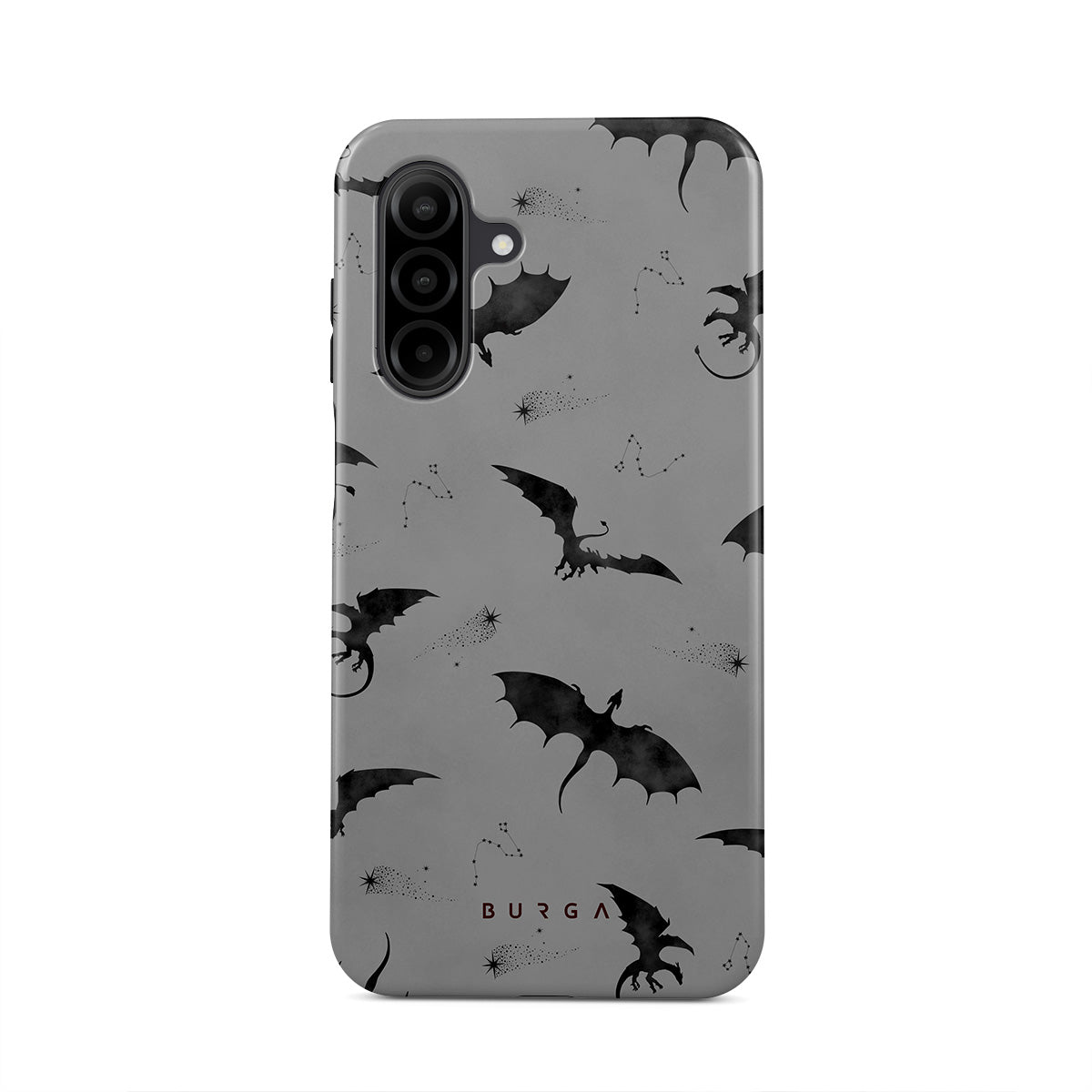 このデザインの特徴:コウモリ、竜、灰色の空、夜空、影の生物。