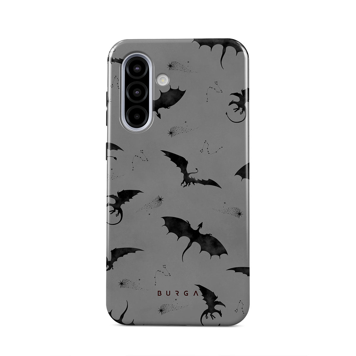 このデザインの特徴:コウモリ、竜、灰色の空、夜空、影の生物。