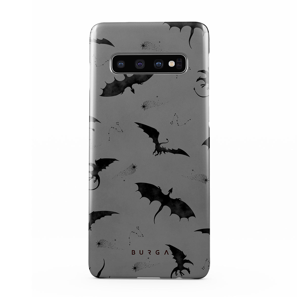 このデザインの特徴:コウモリ、竜、灰色の空、夜空、影の生物。
