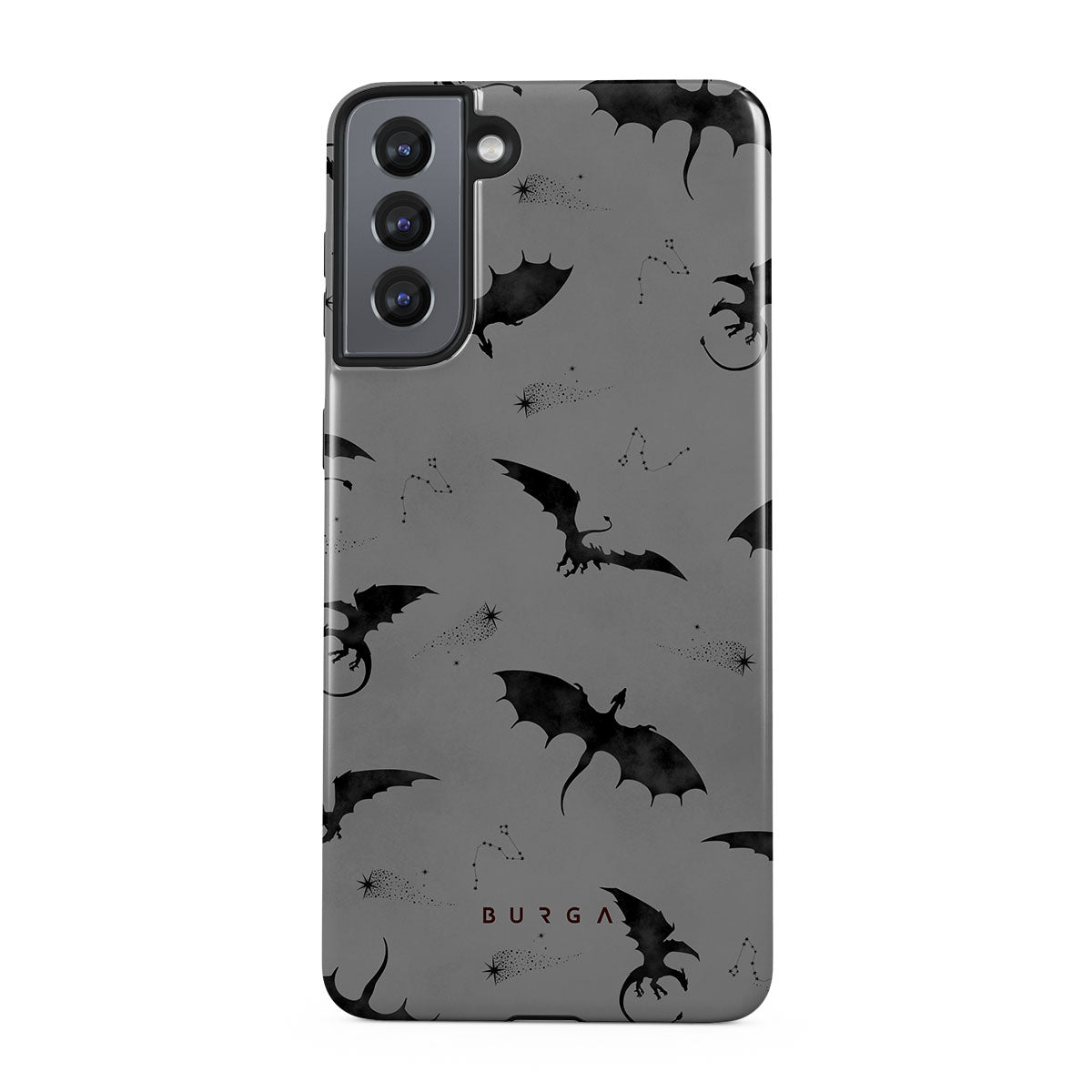 このデザインの特徴:コウモリ、竜、灰色の空、夜空、影の生物。
