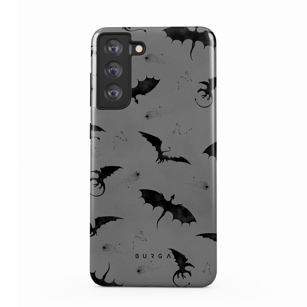 このデザインの特徴:コウモリ、竜、灰色の空、夜空、影の生物。