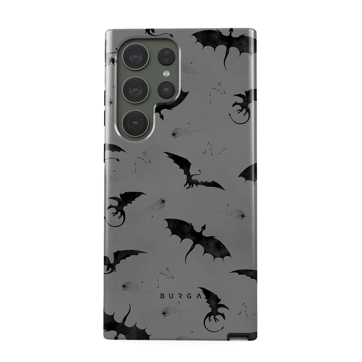 このデザインの特徴:コウモリ、竜、灰色の空、夜空、影の生物。