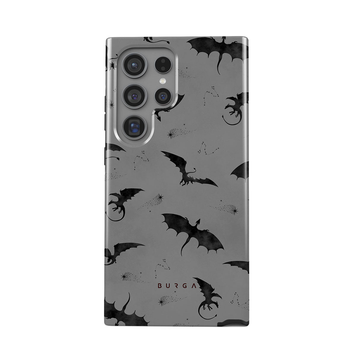 このデザインの特徴:コウモリ、竜、灰色の空、夜空、影の生物。