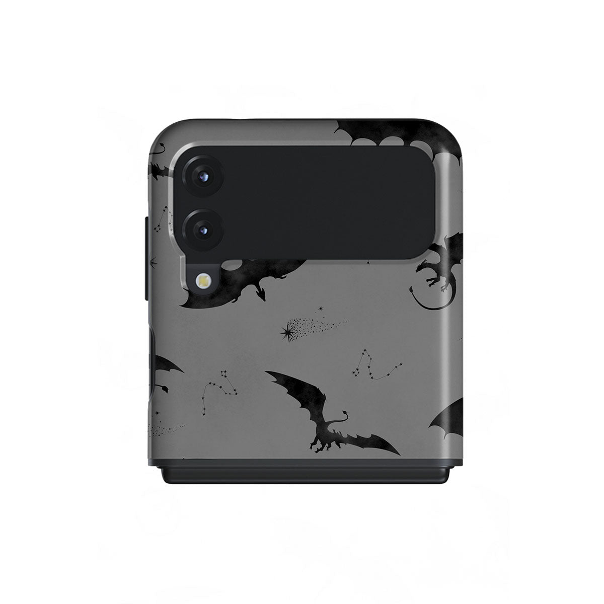 このデザインの特徴:コウモリ、竜、灰色の空、夜空、影の生物。