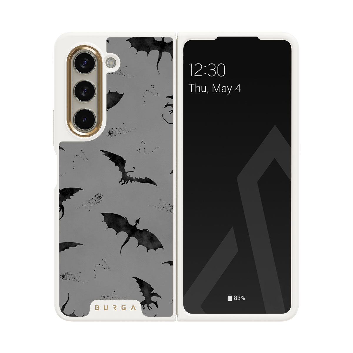 このデザインの特徴:コウモリ、竜、灰色の空、夜空、影の生物。