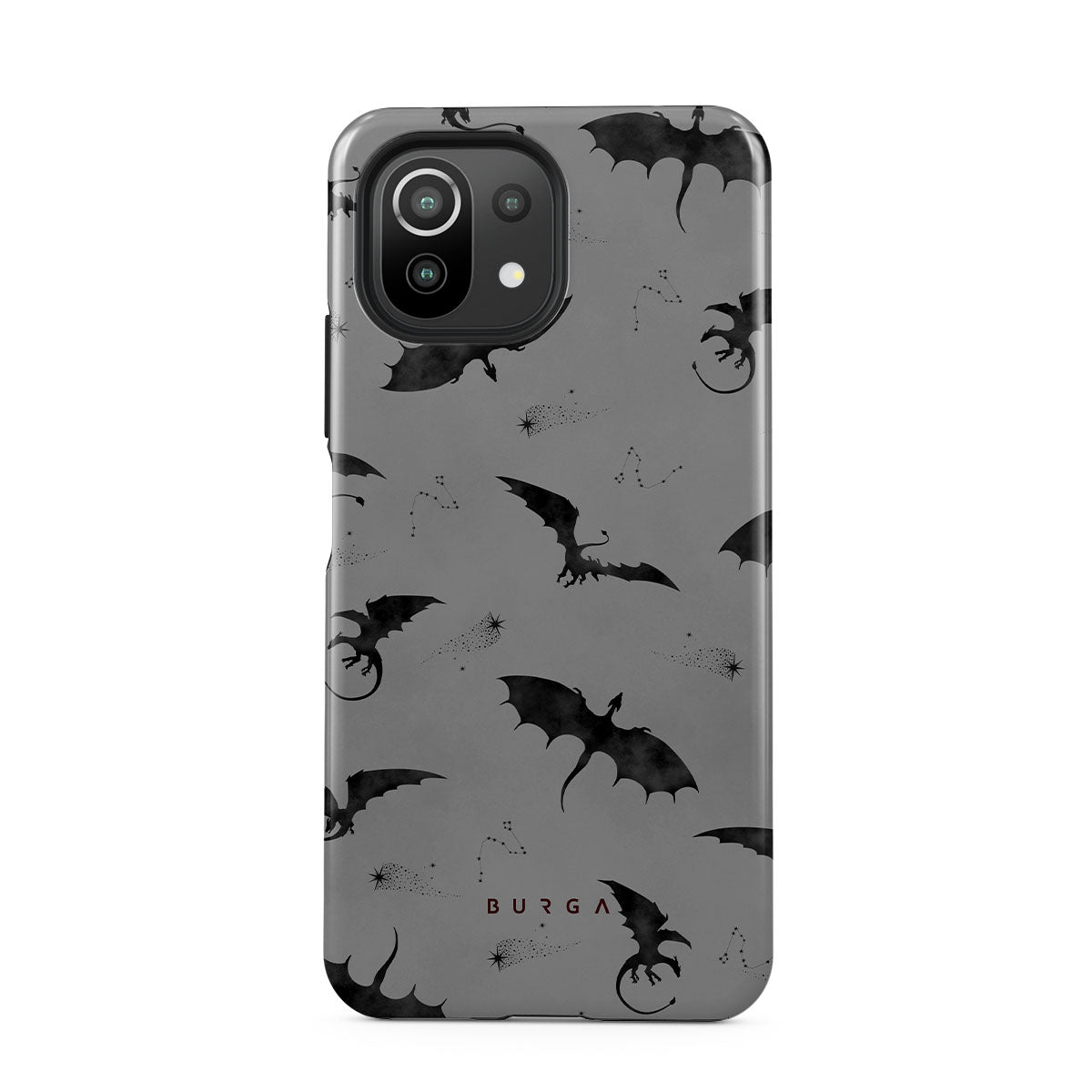 このデザインの特徴:コウモリ、竜、灰色の空、夜空、影の生物。