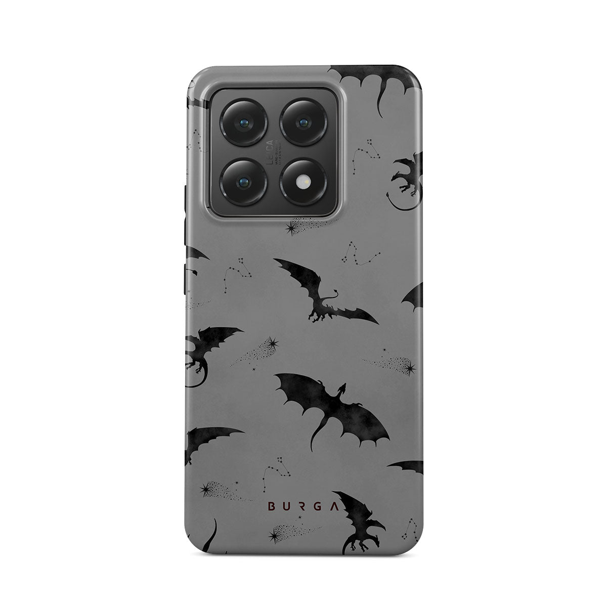 このデザインの特徴:コウモリ、竜、灰色の空、夜空、影の生物。