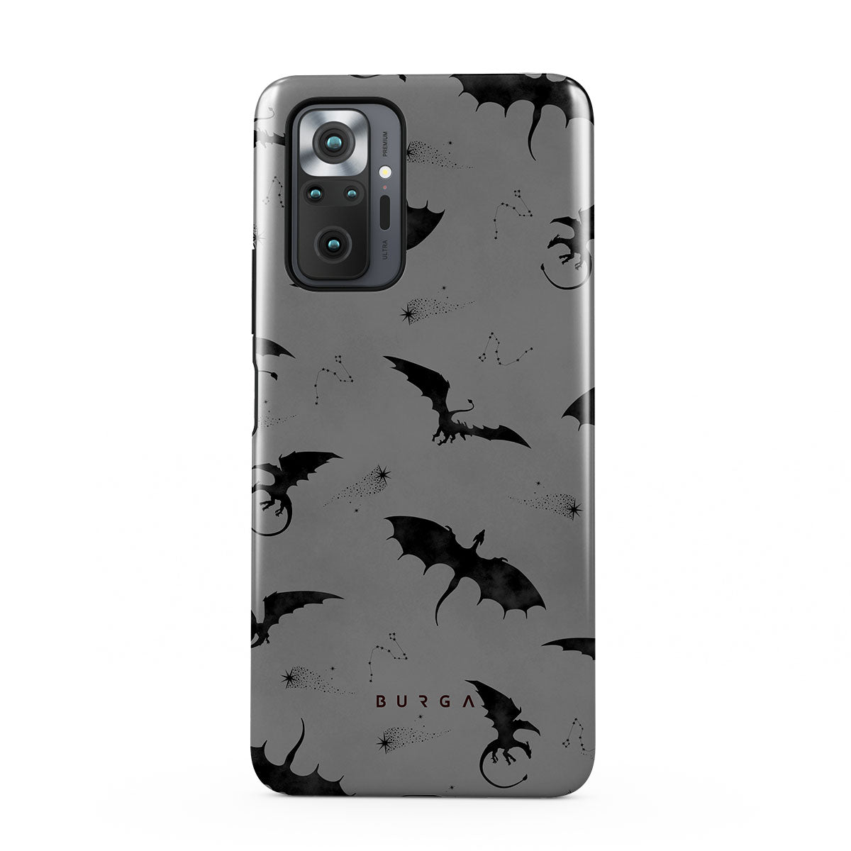 このデザインの特徴:コウモリ、竜、灰色の空、夜空、影の生物。