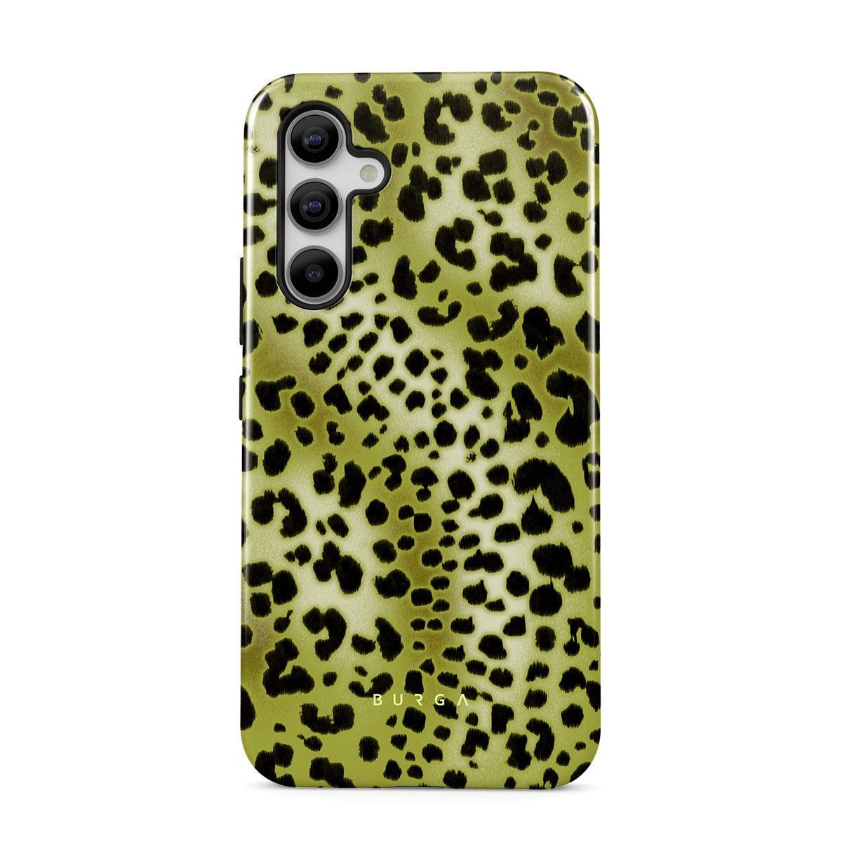 このデザインの特徴:ヒョウ柄、斑点、オリーブグリーン、動物のプリントがあります