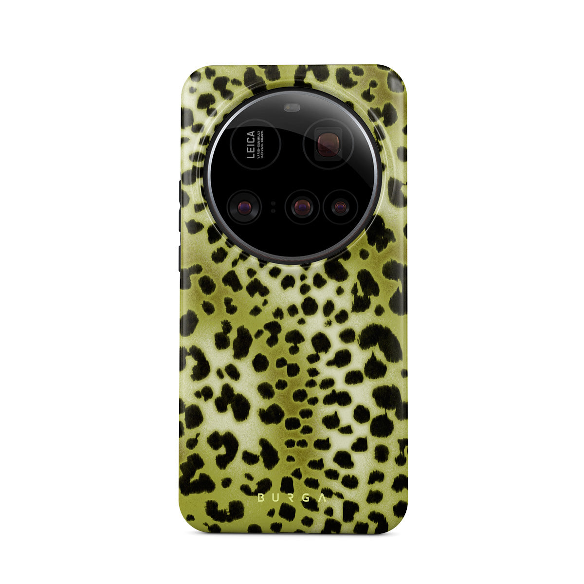 このデザインの特徴:ヒョウ柄、斑点、オリーブグリーン、動物のプリントがあります