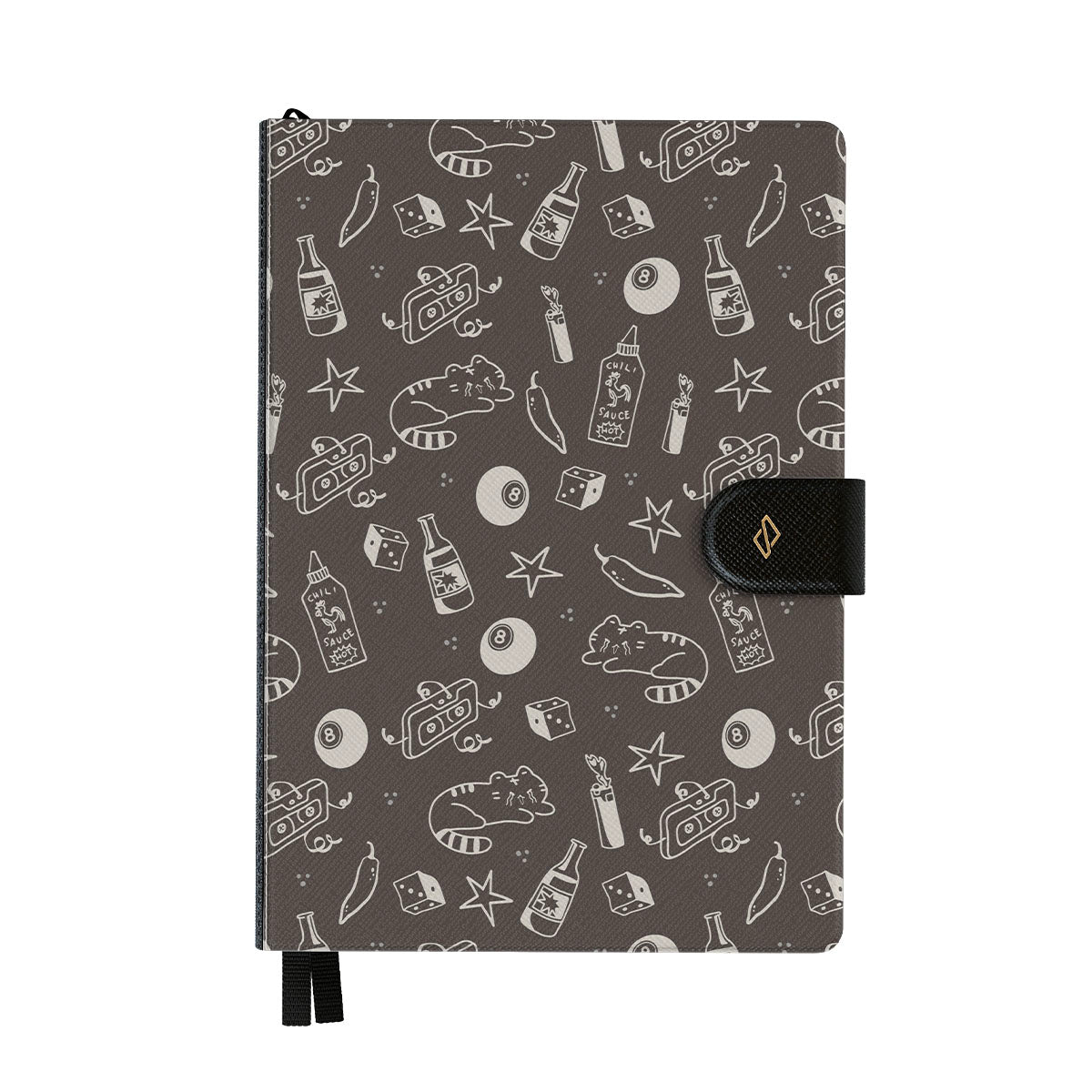 このデザインの特徴:ブラウン背景、遊び心のあるドゥードゥル、猫、星、ペッパー、ダイス、ビリヤードボール、ミックステープ