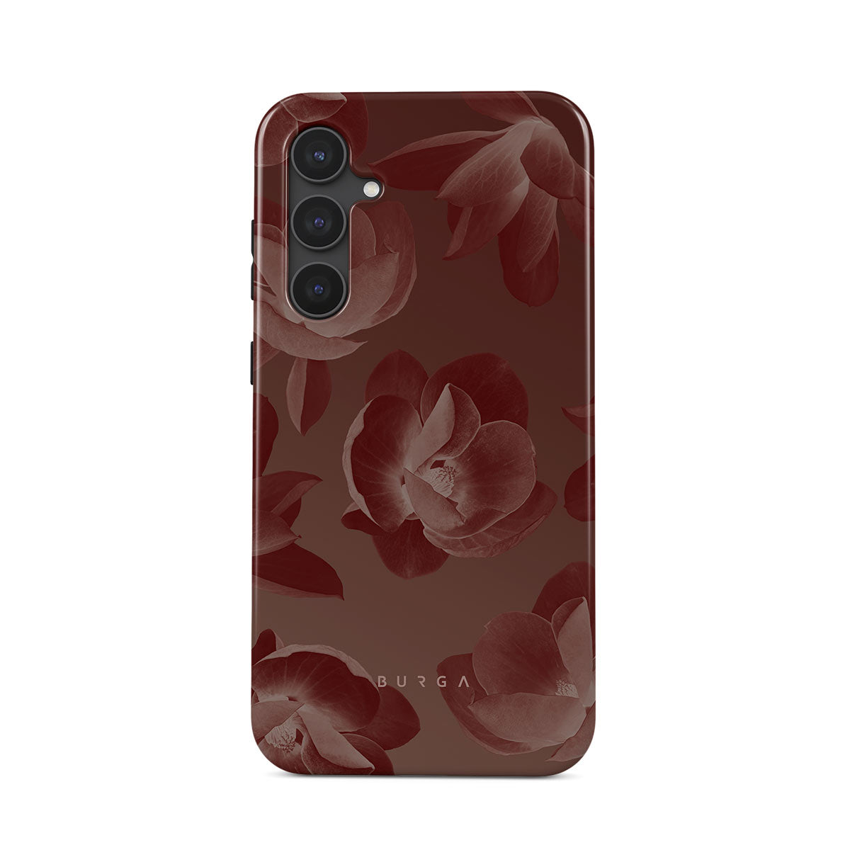 このデザインの特徴:咲き誇るバラ、深紅の色合い。