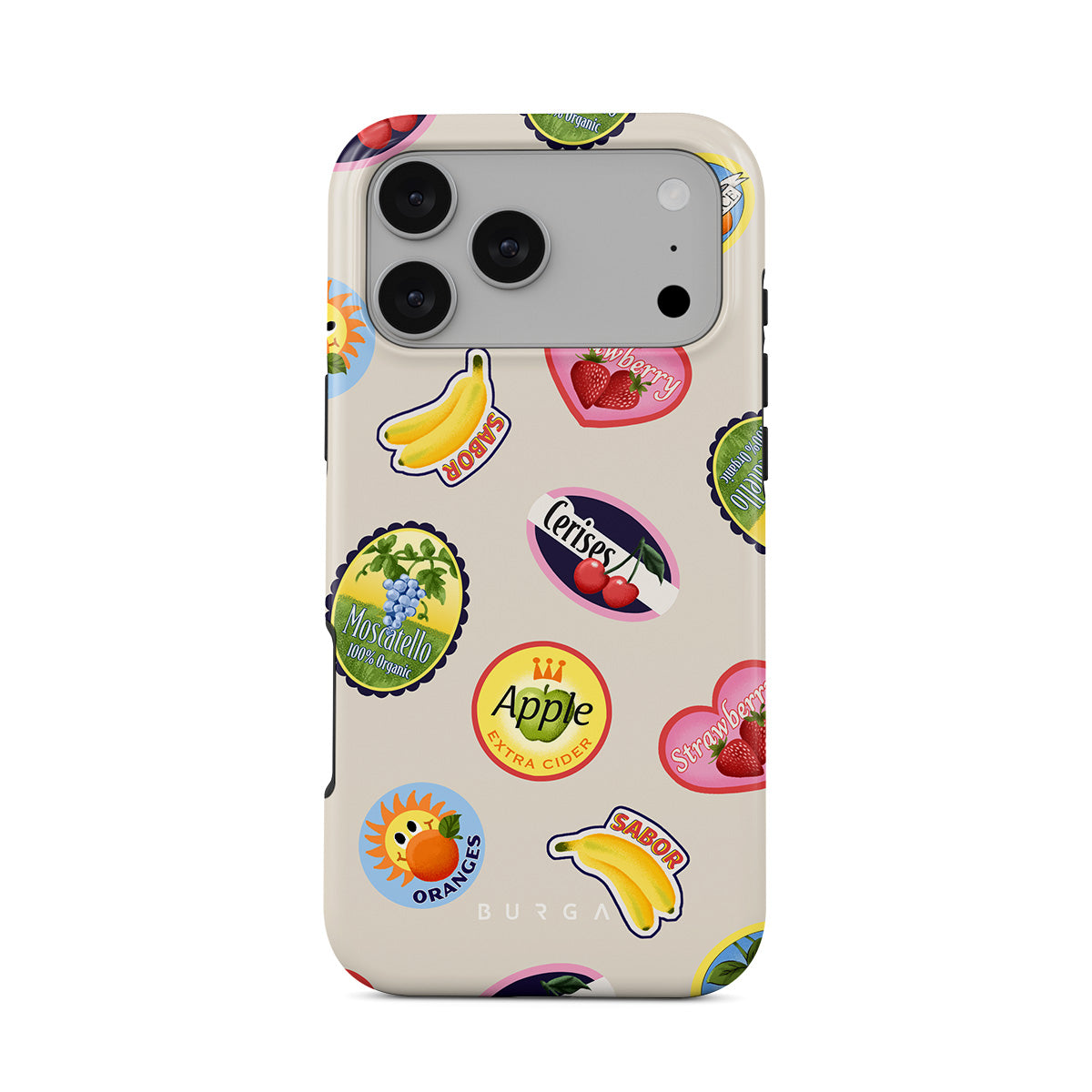 このデザインの特徴バナナ、切手、さくらんぼ、りんご、オレンジ、いちご、鮮やかな色、シトラスアクセント、フルーツモチーフ、トロピカルパターンが含まれています