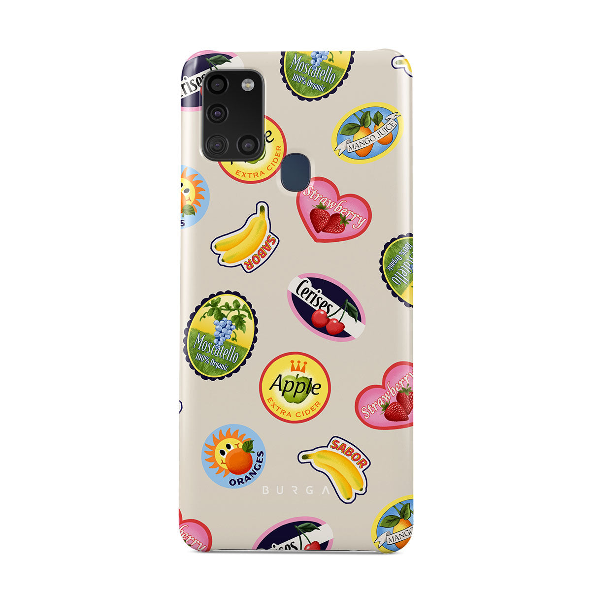 このデザインの特徴バナナ、切手、さくらんぼ、りんご、オレンジ、いちご、鮮やかな色、シトラスアクセント、フルーツモチーフ、トロピカルパターンが含まれています