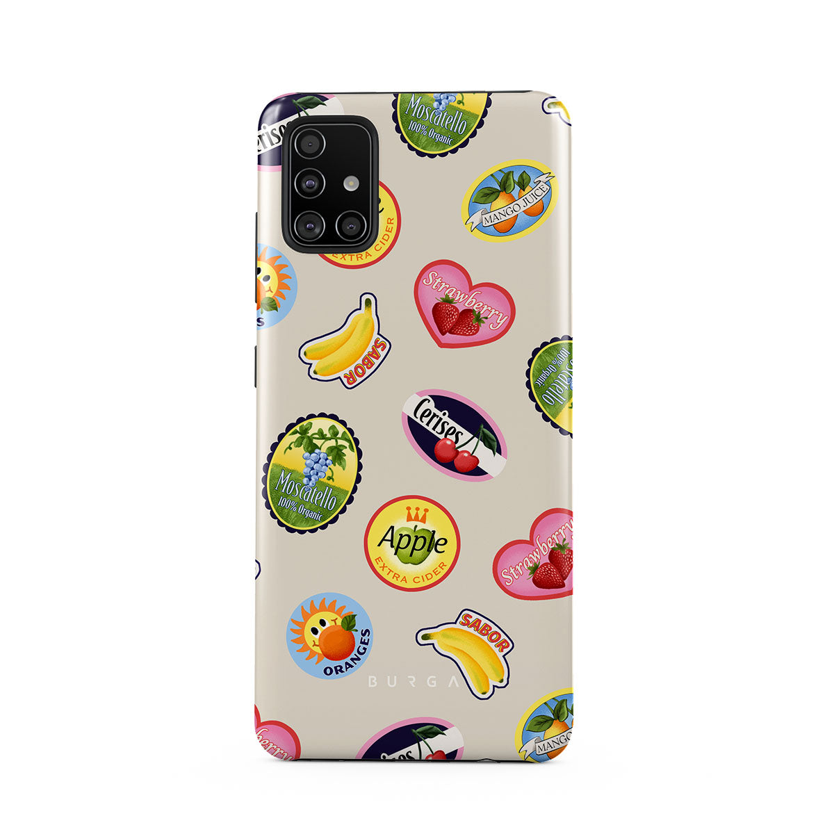 このデザインの特徴バナナ、切手、さくらんぼ、りんご、オレンジ、いちご、鮮やかな色、シトラスアクセント、フルーツモチーフ、トロピカルパターンが含まれています