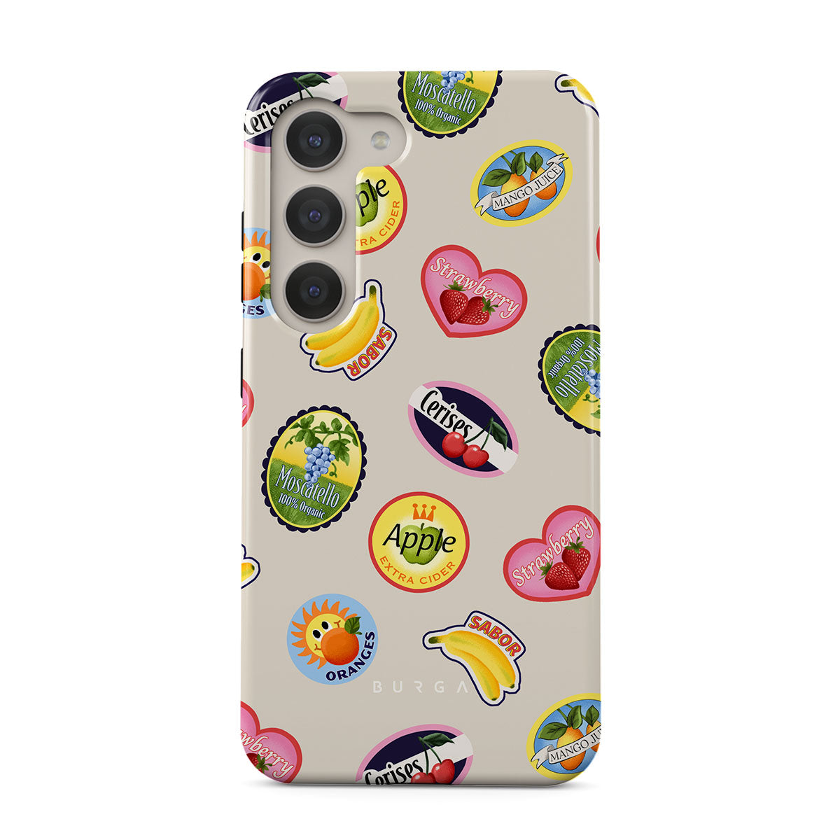 このデザインの特徴バナナ、切手、さくらんぼ、りんご、オレンジ、いちご、鮮やかな色、シトラスアクセント、フルーツモチーフ、トロピカルパターンが含まれています