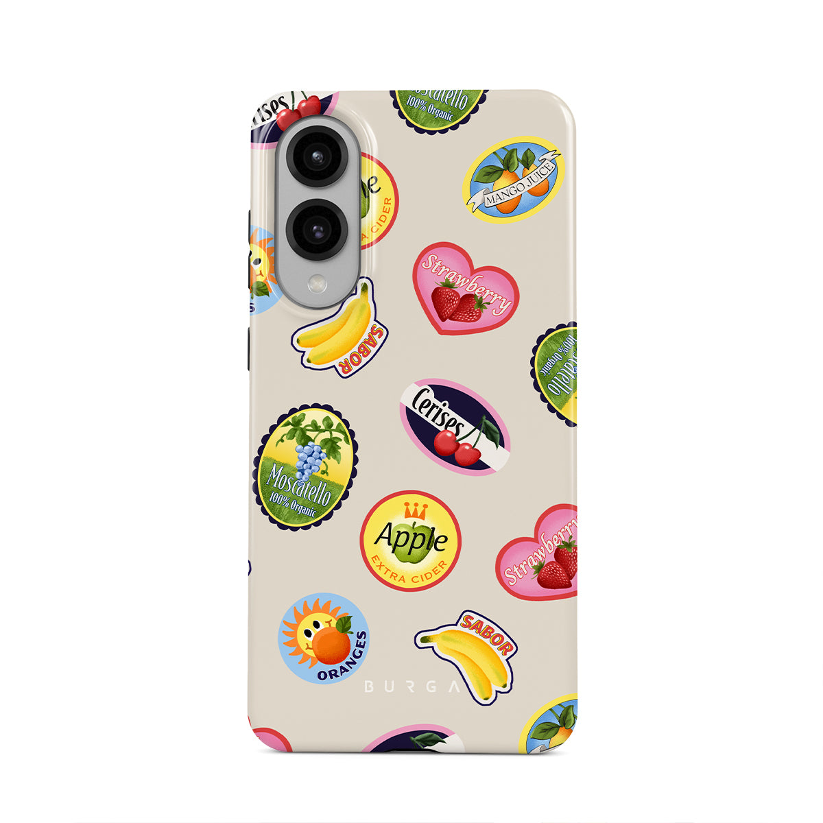 このデザインの特徴バナナ、切手、さくらんぼ、りんご、オレンジ、いちご、鮮やかな色、シトラスアクセント、フルーツモチーフ、トロピカルパターンが含まれています