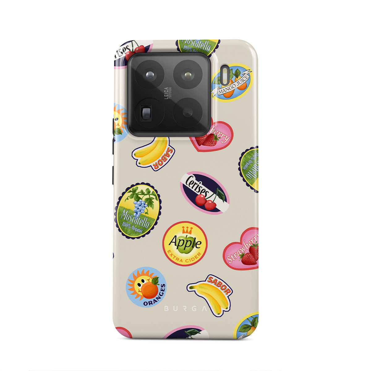 このデザインの特徴バナナ、切手、さくらんぼ、りんご、オレンジ、いちご、鮮やかな色、シトラスアクセント、フルーツモチーフ、トロピカルパターンが含まれています