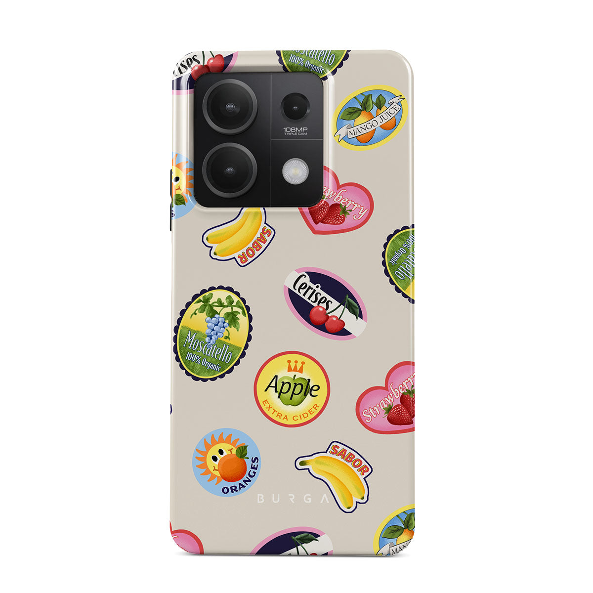 このデザインの特徴バナナ、切手、さくらんぼ、りんご、オレンジ、いちご、鮮やかな色、シトラスアクセント、フルーツモチーフ、トロピカルパターンが含まれています