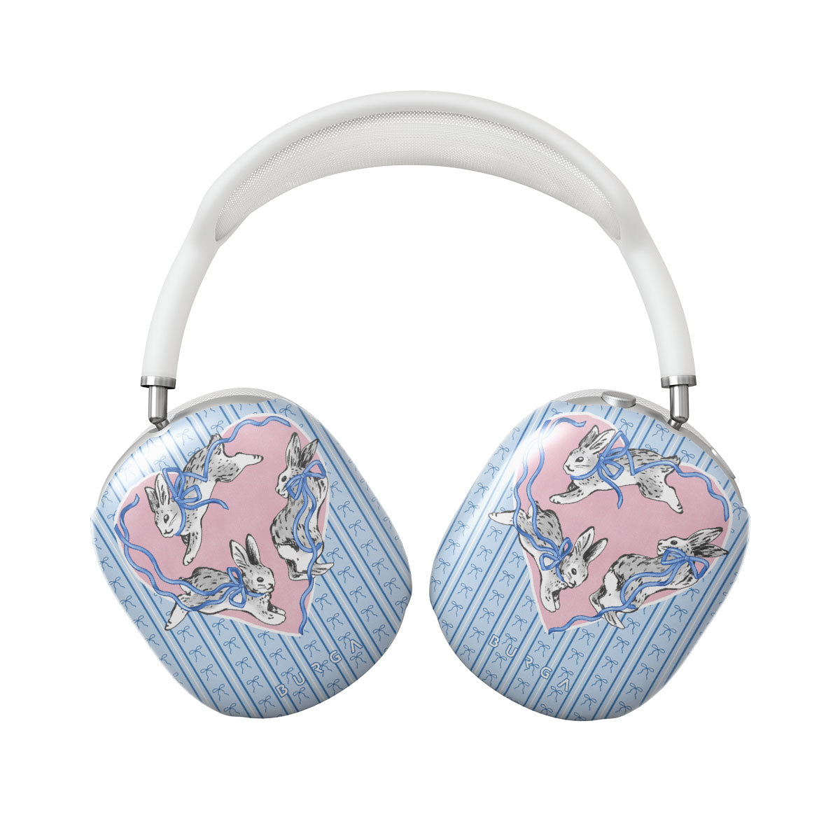 このデザインの特徴白ウサギ、ハート型フレーム、青いストライプ