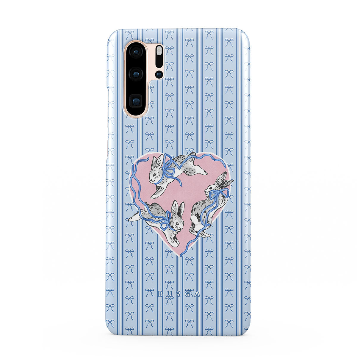 このデザインの特徴白ウサギ、ハート型フレーム、青いストライプ