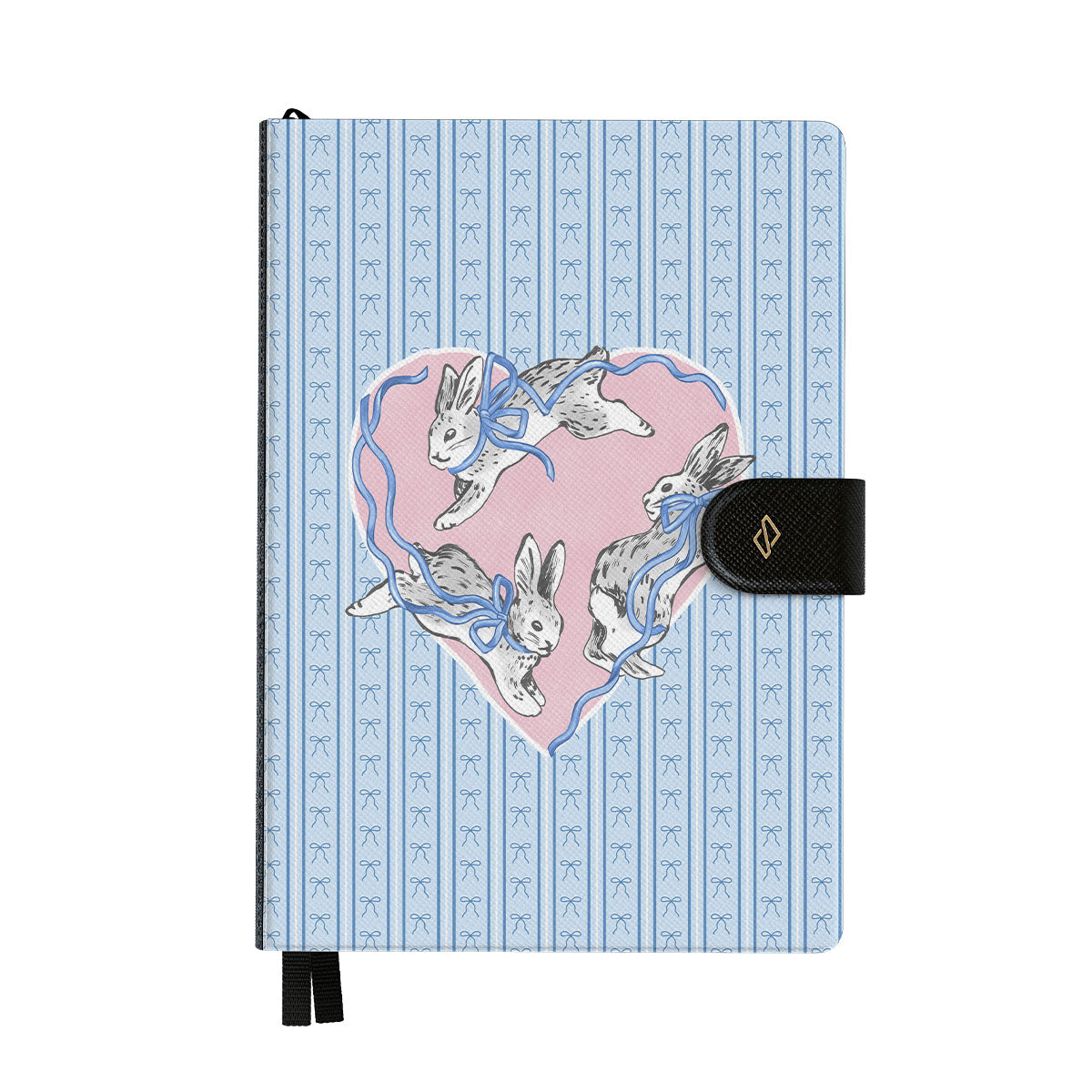 このデザインの特徴白ウサギ、ハート型フレーム、青いストライプ