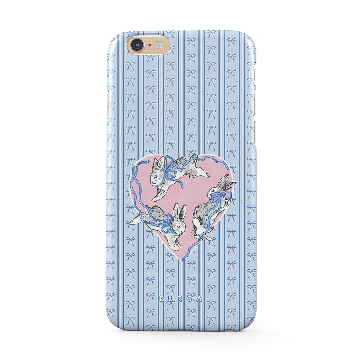 このデザインの特徴白ウサギ、ハート型フレーム、青いストライプ