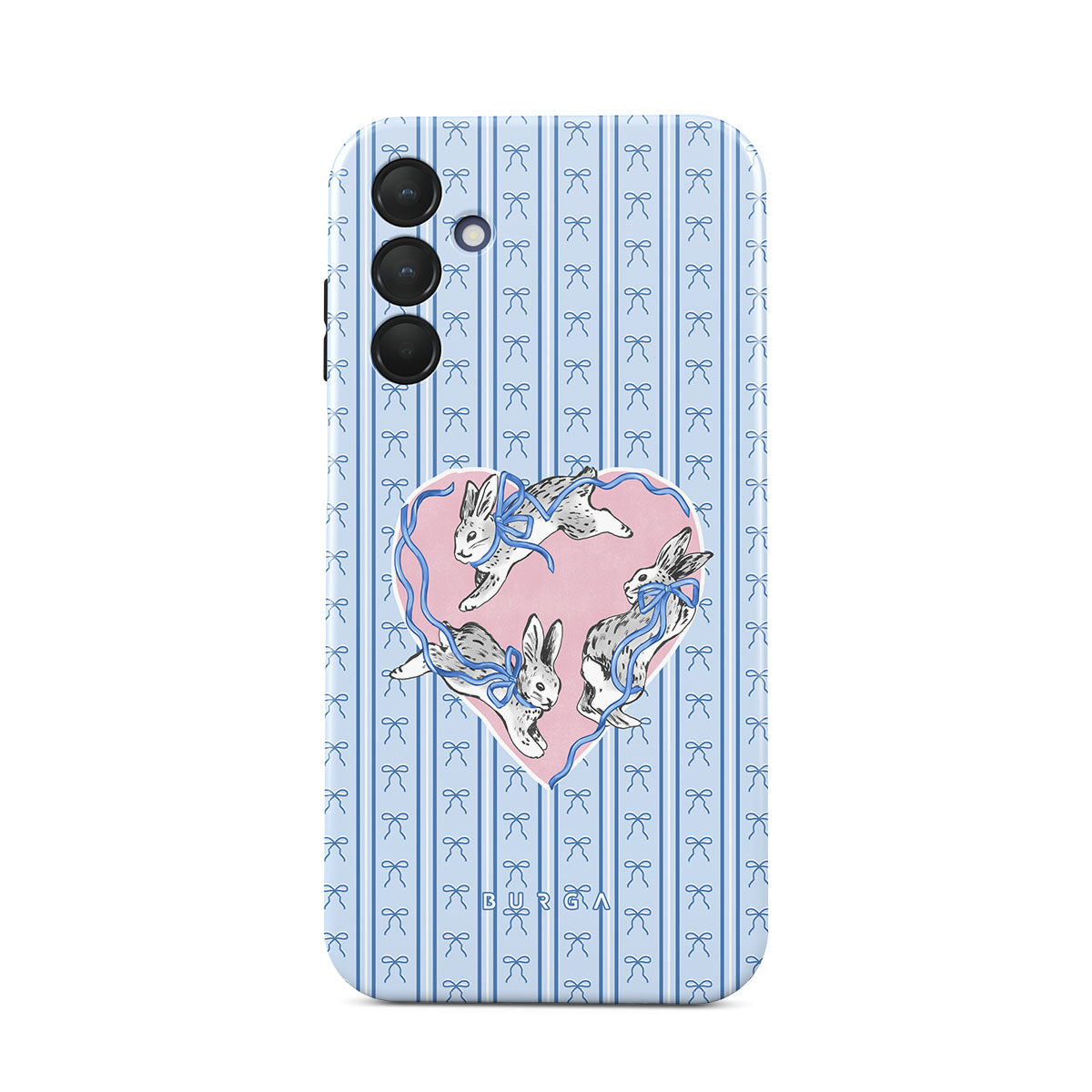 このデザインの特徴白ウサギ、ハート型フレーム、青いストライプ