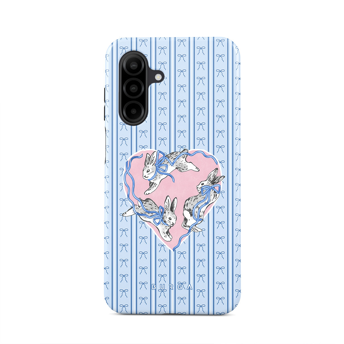 このデザインの特徴白ウサギ、ハート型フレーム、青いストライプ