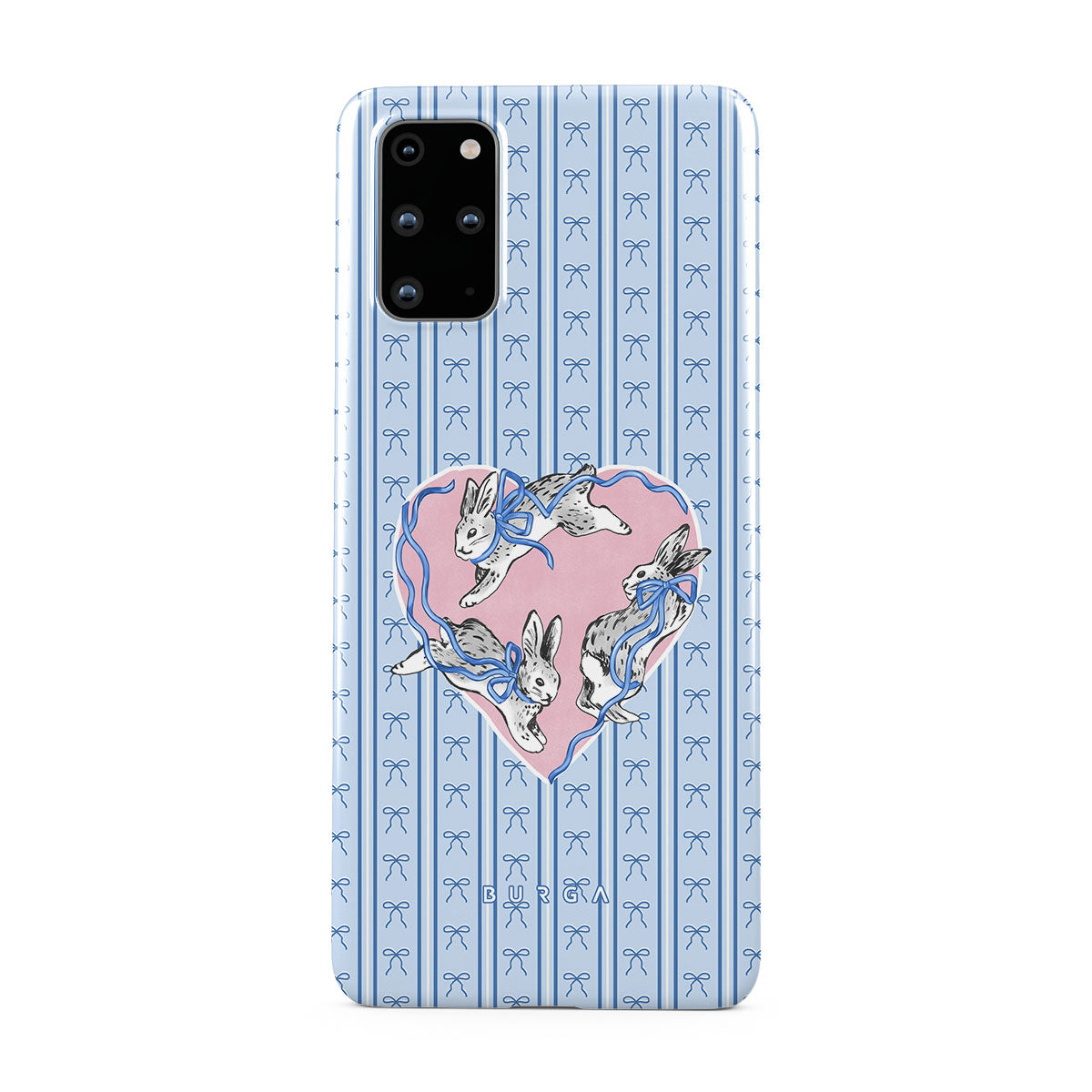 このデザインの特徴白ウサギ、ハート型フレーム、青いストライプ