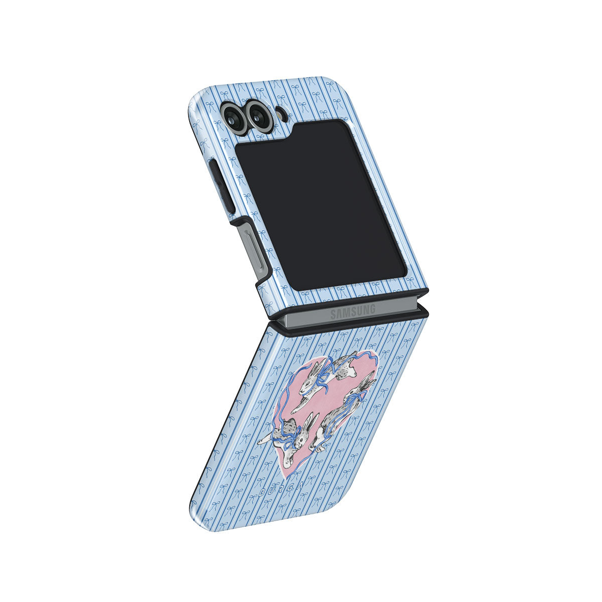 このデザインの特徴白ウサギ、ハート型フレーム、青いストライプ