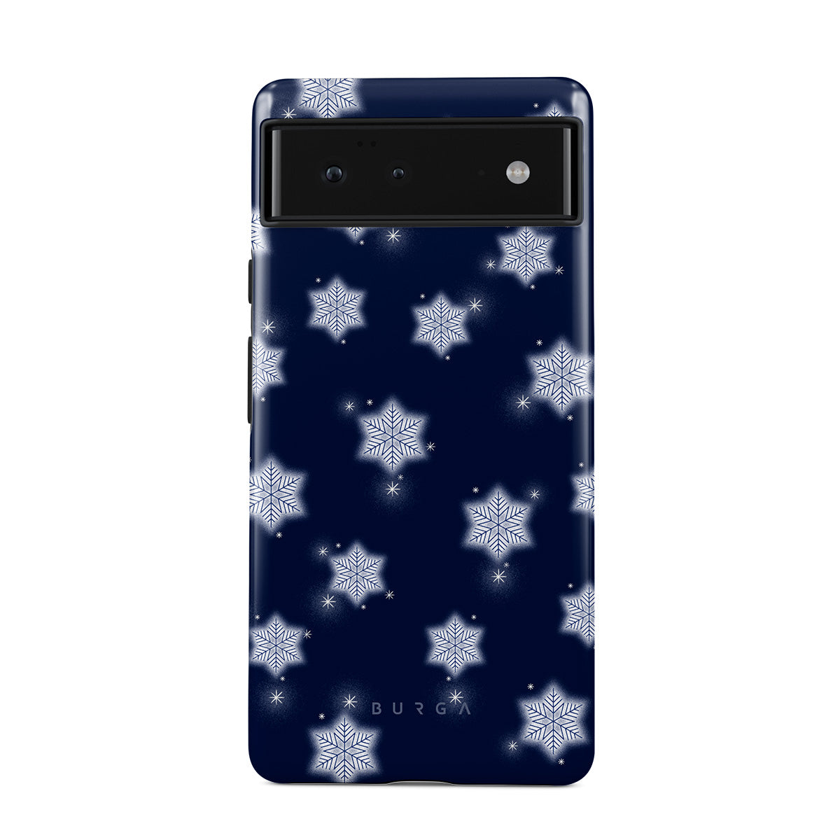 このデザインの特徴:白い雪の結晶、ネイビーブルーの背景、冬の雪の結晶模様、幾何学的な雪の結晶、クラシックな冬のデザイン