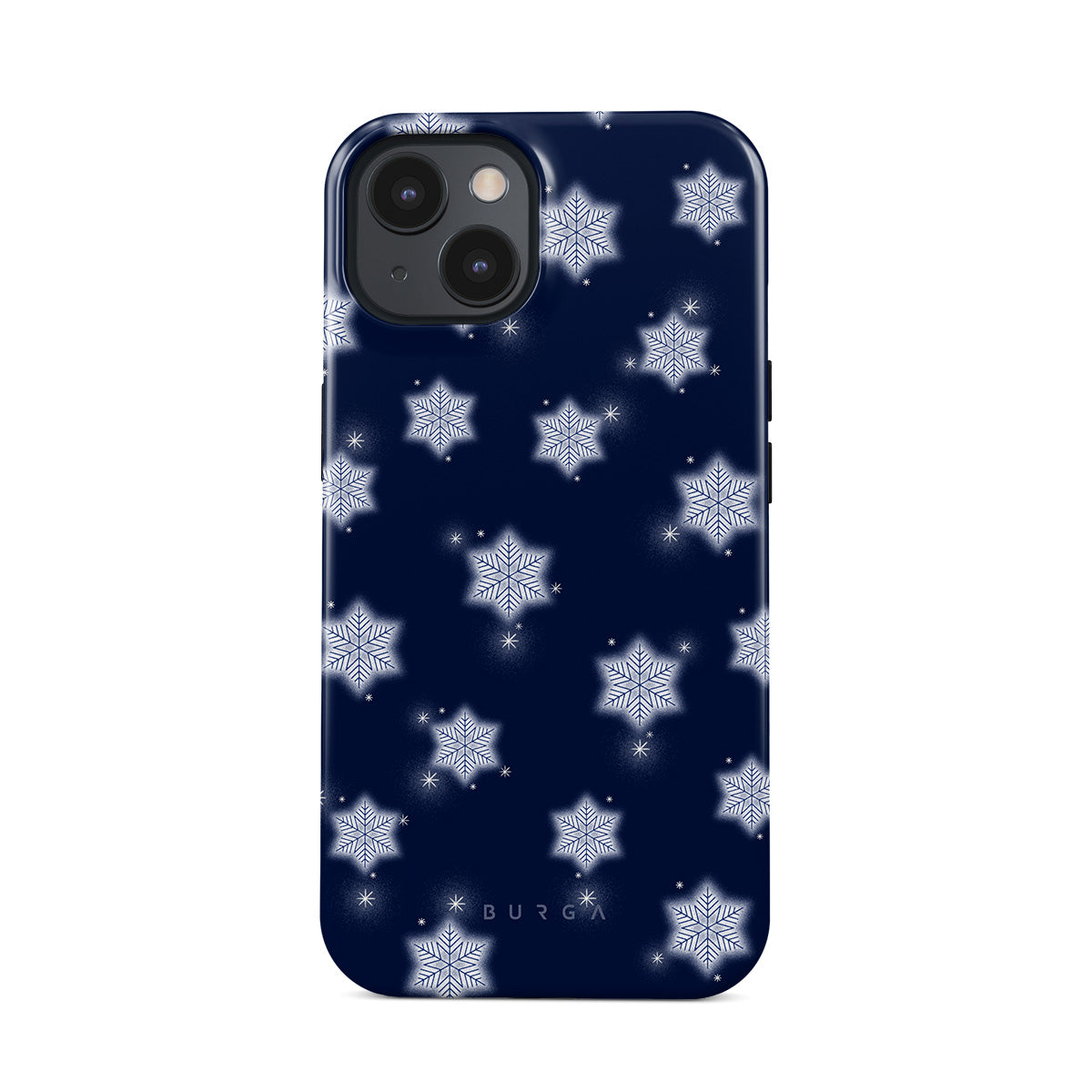 このデザインの特徴:白い雪の結晶、ネイビーブルーの背景、冬の雪の結晶模様、幾何学的な雪の結晶、クラシックな冬のデザイン